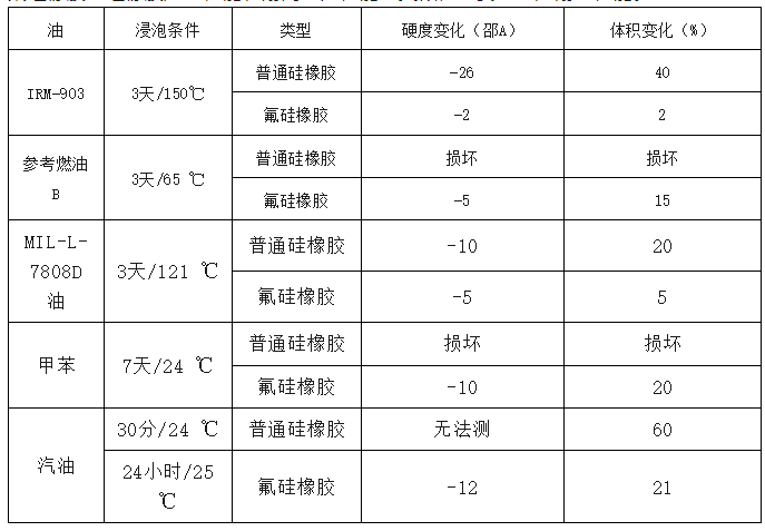 氟硅橡膠與普通硅橡膠比較,氟硅橡膠與硅橡膠加工性能、耐高低溫性能均類似,主要差別是耐油性能,上面明顯可見在經(jīng)過不同參數(shù)的對比后,普通硅膠材質不論在硬度還是形狀的都有一定的差異。